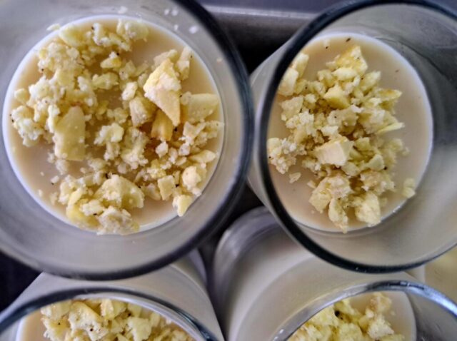 滑らかなムースの層と表面には蒸して粗く潰した物を。スパイスで少々アクセントを。